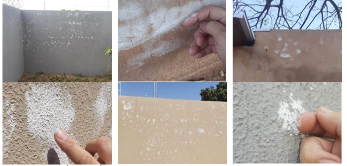 R: Obrigatoriamente a patologia é exposta com alguma fissura na superfície, ou seja, a mesma decorre de dentro para fora. É visível a formação de porções arredondadas de pó branco ou manchas escorridas iniciando de pontos específicos no entorno de fissuras, parafusos, haste de cerca elétrica, rufos mal fixados etc.). Observa-se ainda mais evidente em superfícies sem pintura.